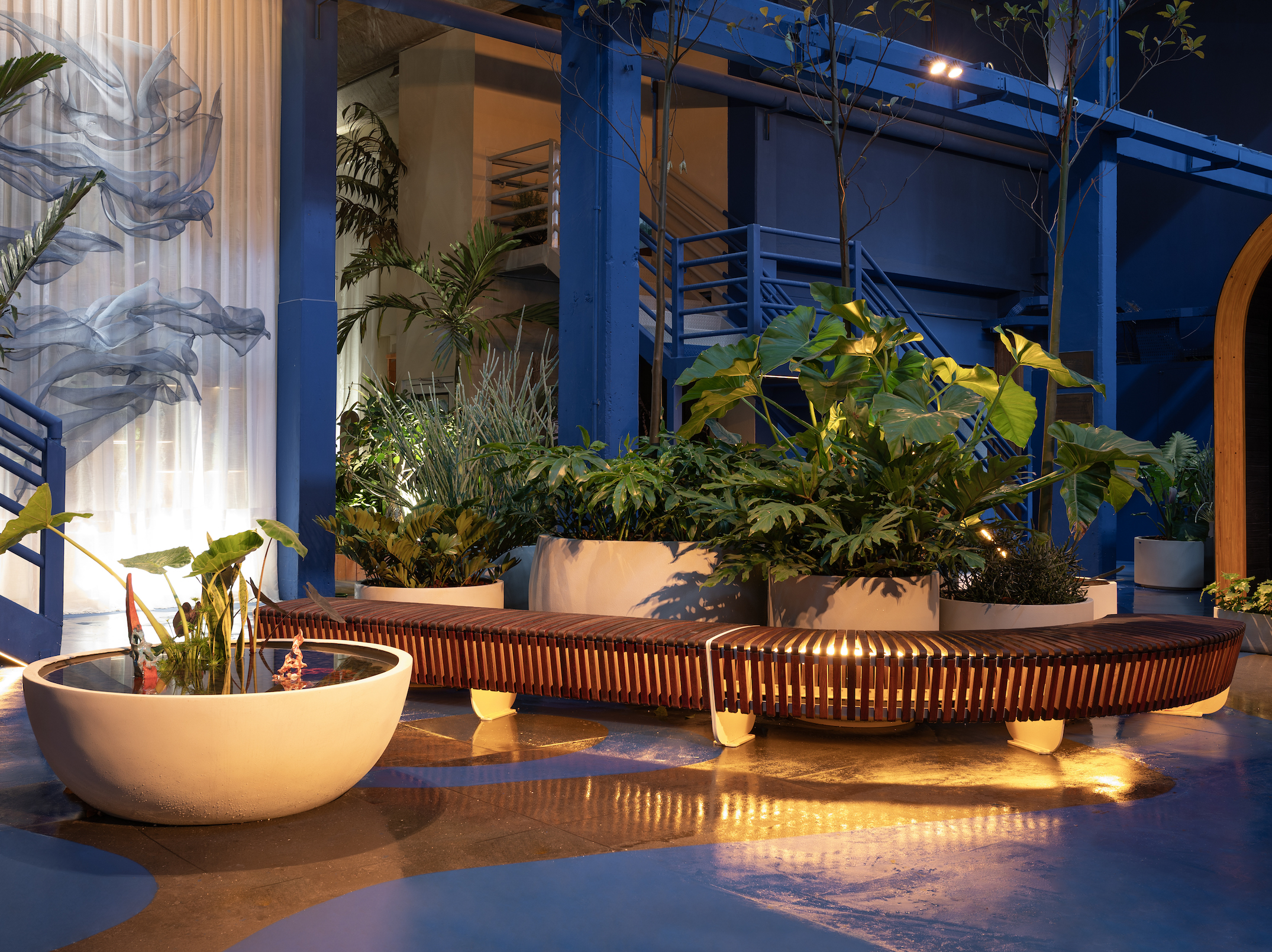O escritório Terraço Paisagismo propõe, em meio a um galpão industrial, um jardim de contemplação que desafia expectativas. A Praça Mergulho Urbano surge como um refúgio tropical em plena área fabril: névoa, espelhos d’água e vegetação aquática criam uma atmosfera de sonho, em que o visitante é convidado a “mergulhar” em sensações. A iluminação âmbar, o arco suspenso com sistema de nebulização e a preservação dos traços originais do galpão compõem uma narrativa sobre memória e renovação. A proposta, mais do que estética, é uma experiência sensorial completa — um lembrete de que a natureza pode florescer nos lugares mais improváveis.