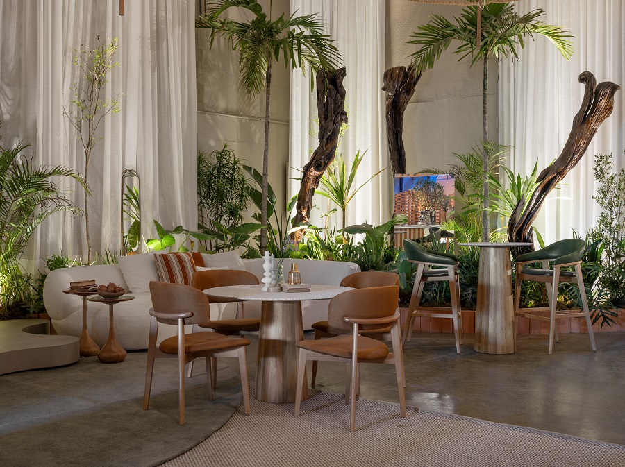 Assinado pelo coletivo Dez Arq.Design, o Café dos Amigos traduz o espírito de convivência e troca que define o tema da mostra. Com 350 m² e vegetação abundante, o espaço recria o conceito de “cidade-jardim” em uma escala social e acolhedora. Inserido no coração da mostra, o café propõe um encontro entre arquitetura, natureza e convivência, valorizando materiais naturais — madeira, pedra, cerâmica artesanal e vegetação tropical — em um ambiente de atmosfera leve e afetiva. As árvores de grande porte integram o interior e o exterior. Mais do que um ponto de pausa, o café é um espaço de pertencimento e celebração das relações humanas.