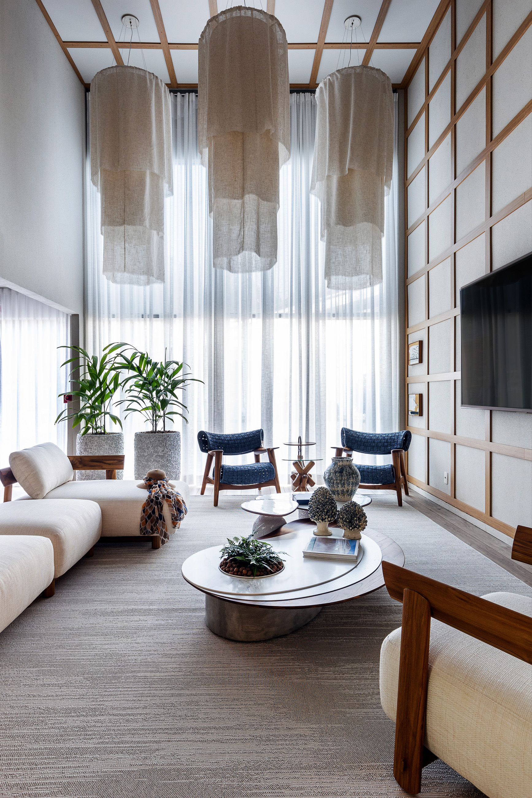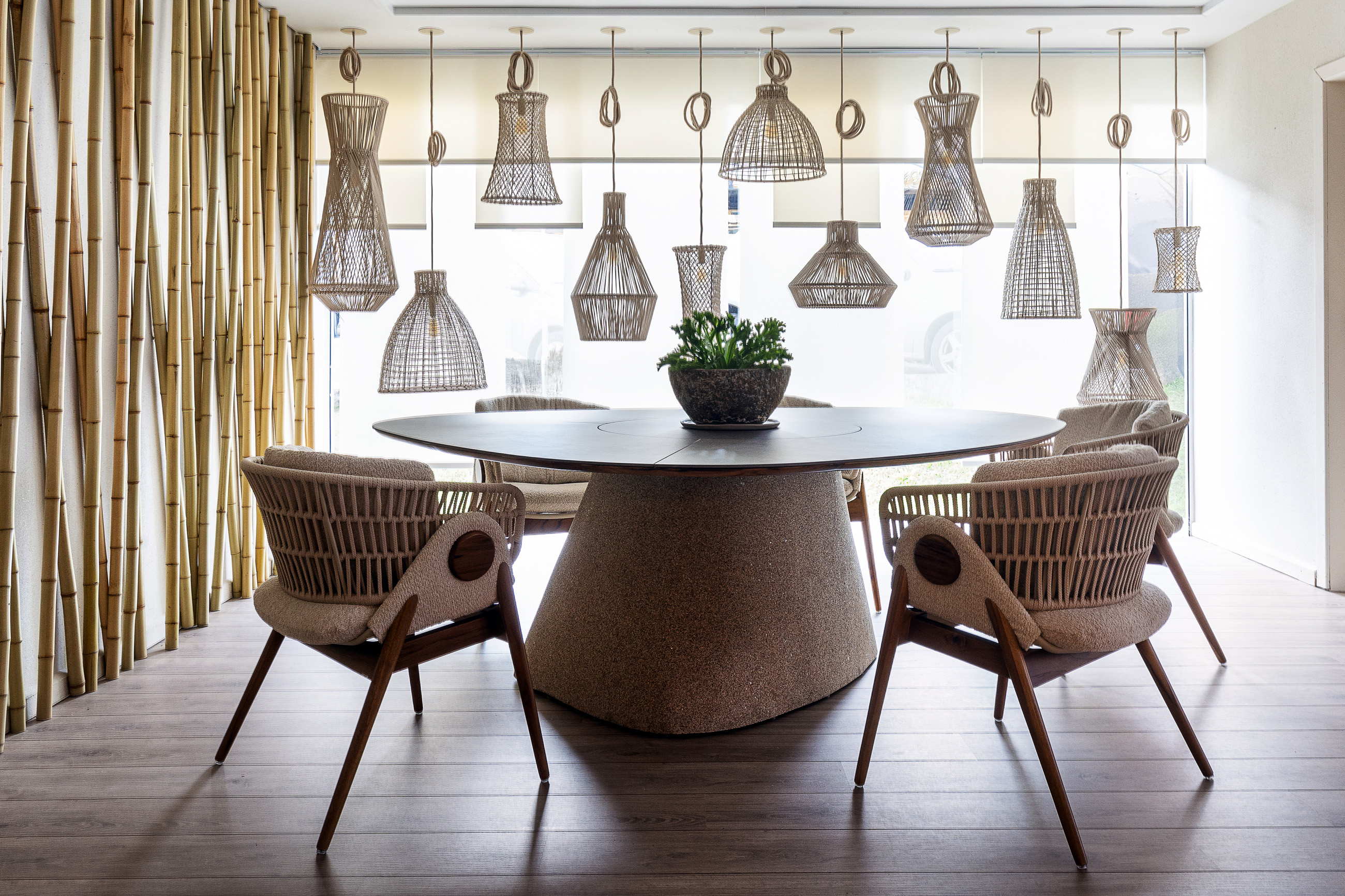 “O bambu e a pedra não estão ali só para serem bonitos”, diz Marcelo Wolschick. “Eles despertam memórias táteis, lembram a gente de um lugar já vivido, seja uma casa de praia ou um quintal ensolarado.” A iluminação, linear e sutil, percorre o ambiente acompanhando sua arquitetura. À medida que o dia avança, ela destaca volumes, reforça a fluidez e prepara o espaço para a atmosfera mais íntima do entardecer.