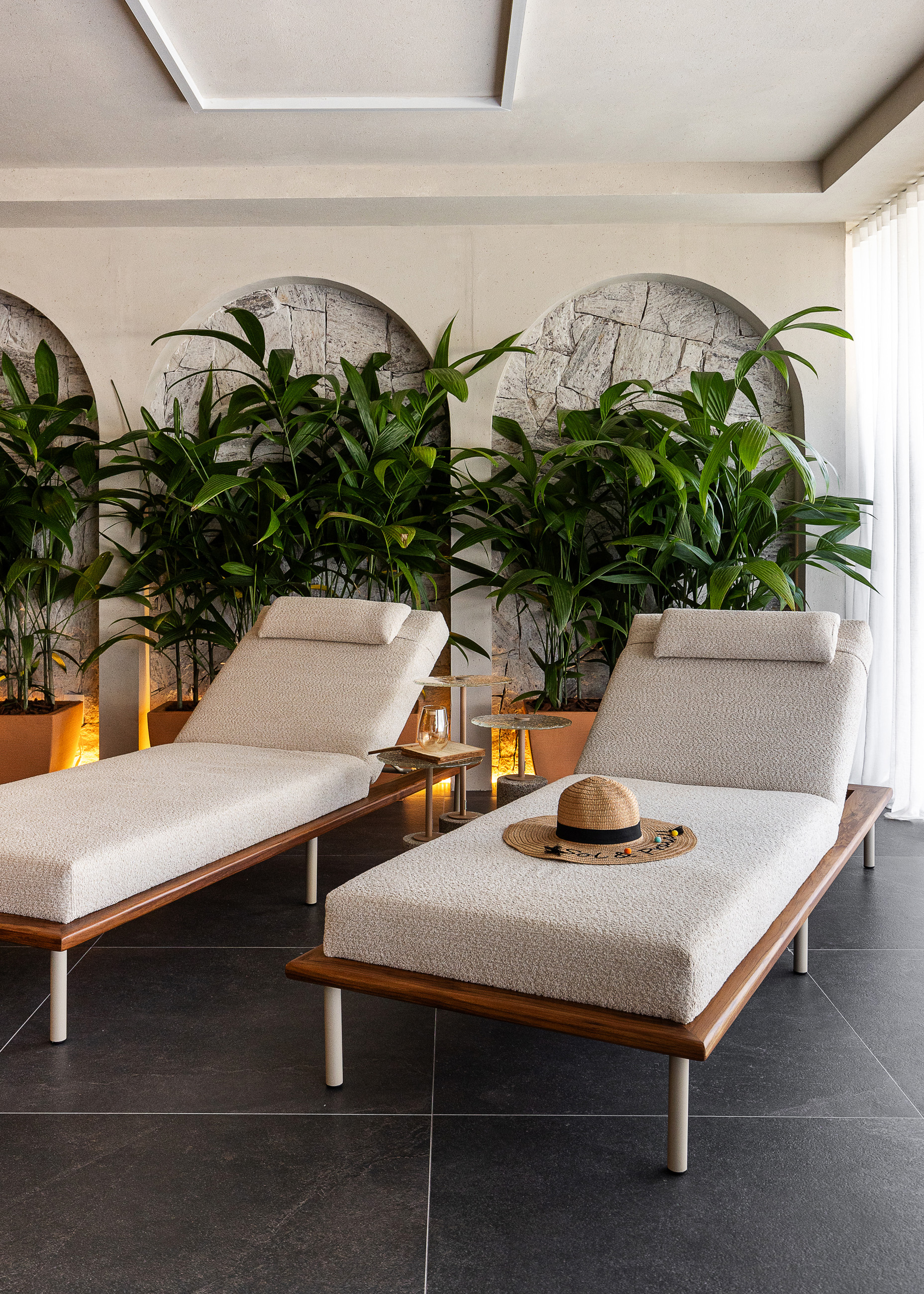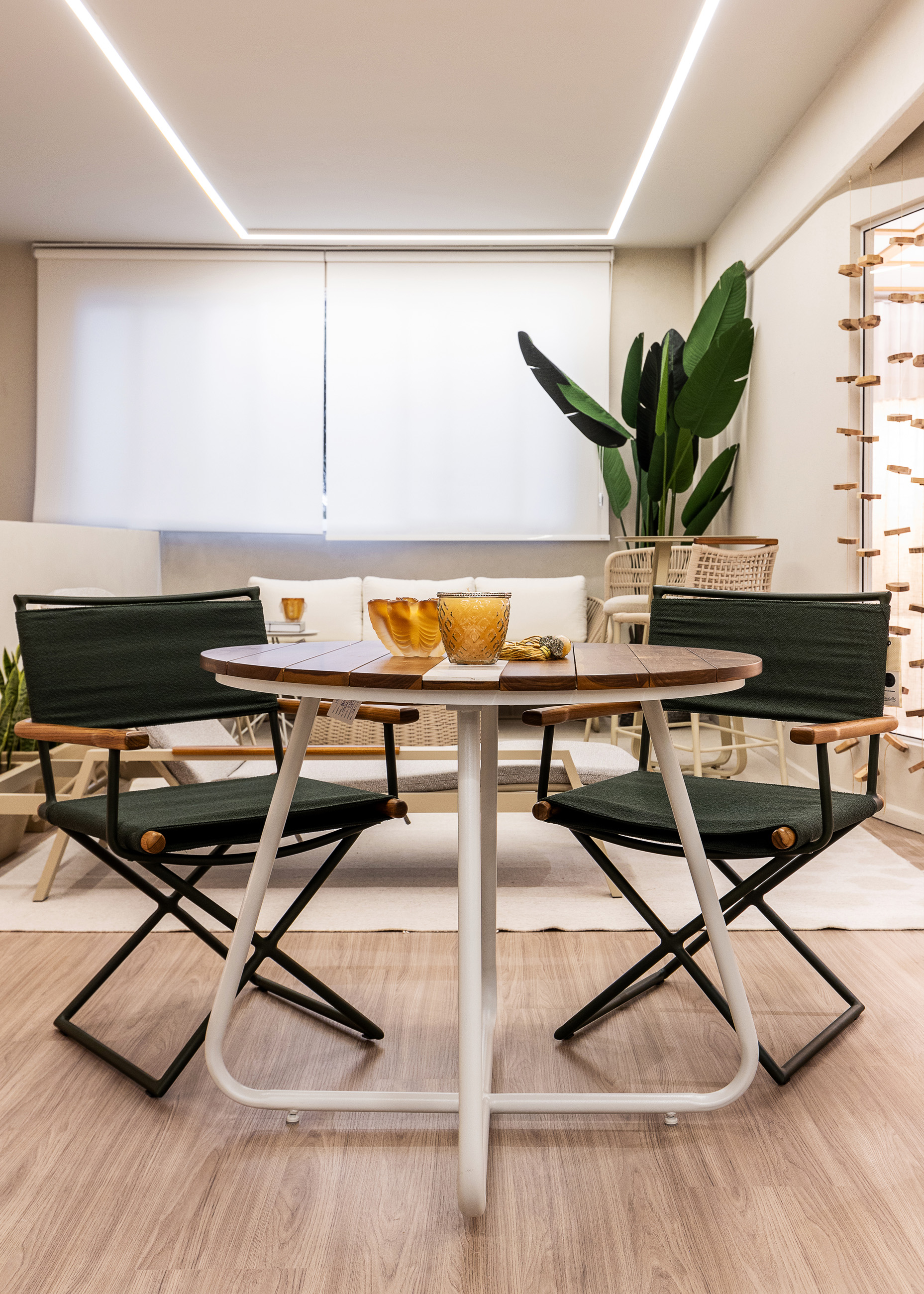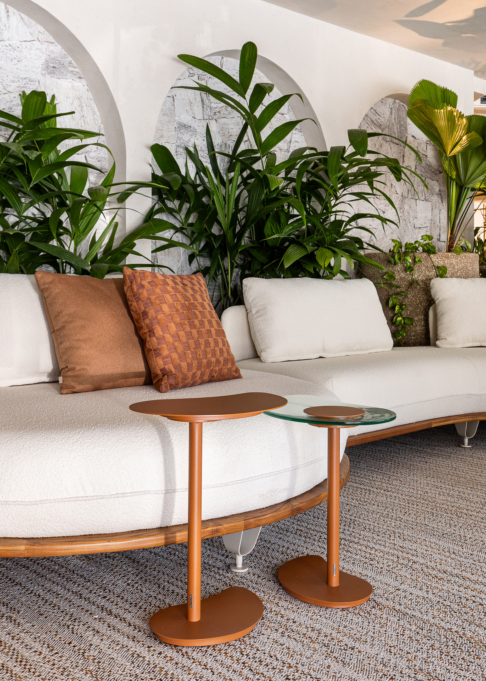 O mobiliário da ContTi Home Design não apenas ocupa o espaço, ele o prolonga. Cada peça (todas da Modalle) parece nascer do cenário, reforçando a integração entre arquitetura, natureza e função. Entre os destaques estão o sofá Vitta (Modalle N&D), que convida a permanecer, e a poltrona Intermezzo, criação de Jayme Bernardo, que alia presença e leveza. A espreguiçadeira Alma Mia, de André Grossi, é um convite direto ao descanso sob a luz filtrada. Para encontros e conversas, a banqueta Campeira e o bistrô Elba, do Estúdio Razzera, oferecem conforto e proximidade. A mesa Sky e o conjunto Terrace reforçam o lado social e versátil do espaço.